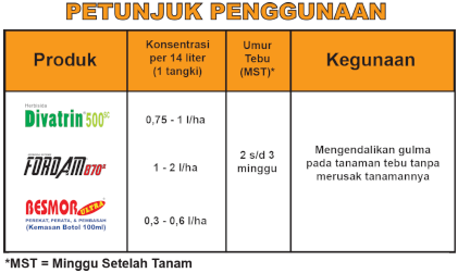 Merupakan paket untuk mengendalikan gulma berdaun lebar dan sempit pada lahan tanaman tebu dan Paket Anti Gulma (PAG) Tebu berisikan, antara lain: